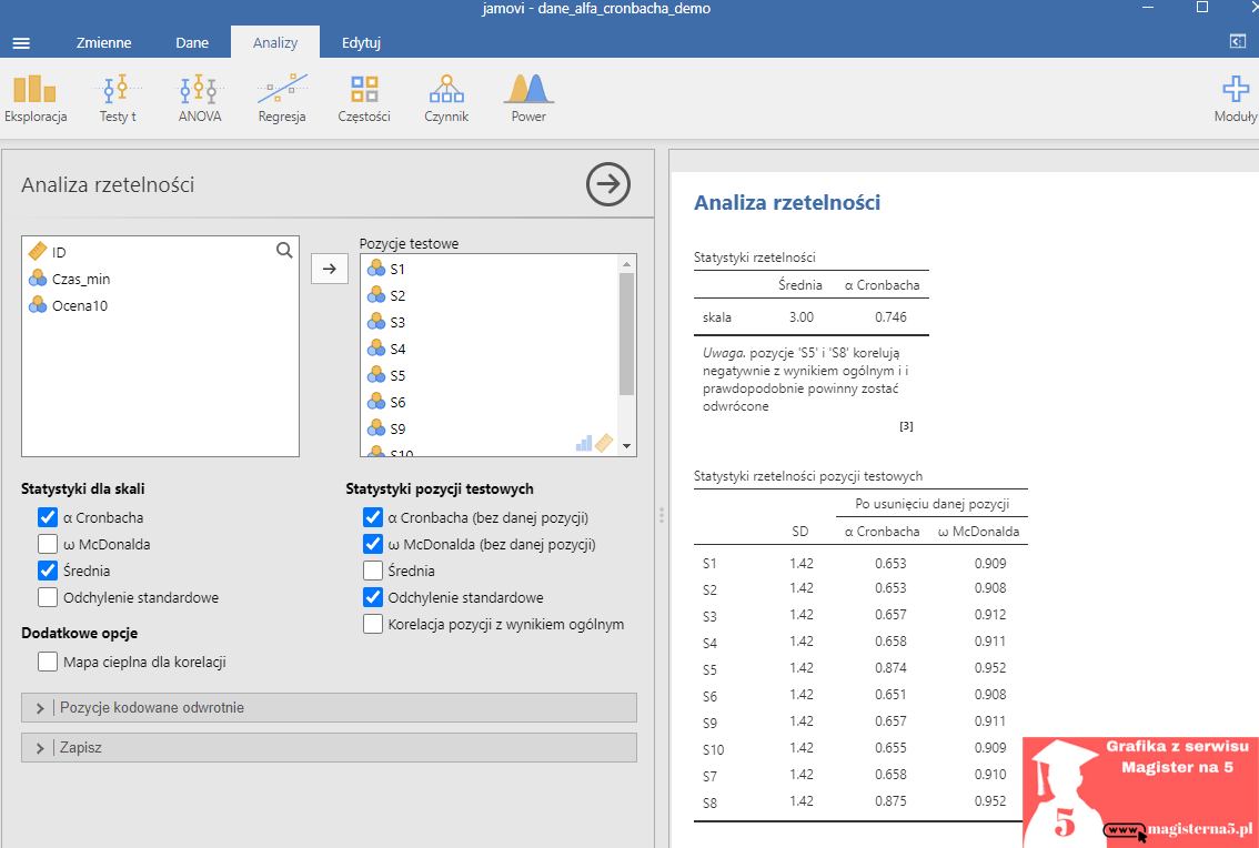 - Szybka naprawa: zrób rekodowanie (np. w skali 1–5: 6 − S5). W Jamovi: dodaj zmienną obliczaną i użyj jej w analizie.