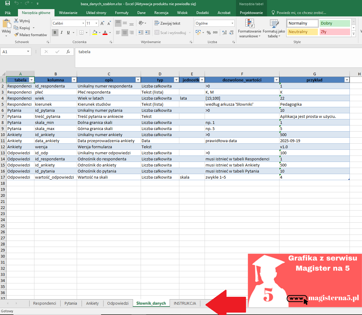 Prosty szablon bazy danych w Excelu do badań ankietowych: arkusze Respondenci, Pytania, Odpowiedzi (każda odpowiedź = 1 wiersz), z listami wyboru i pilnowaniem zakresów.