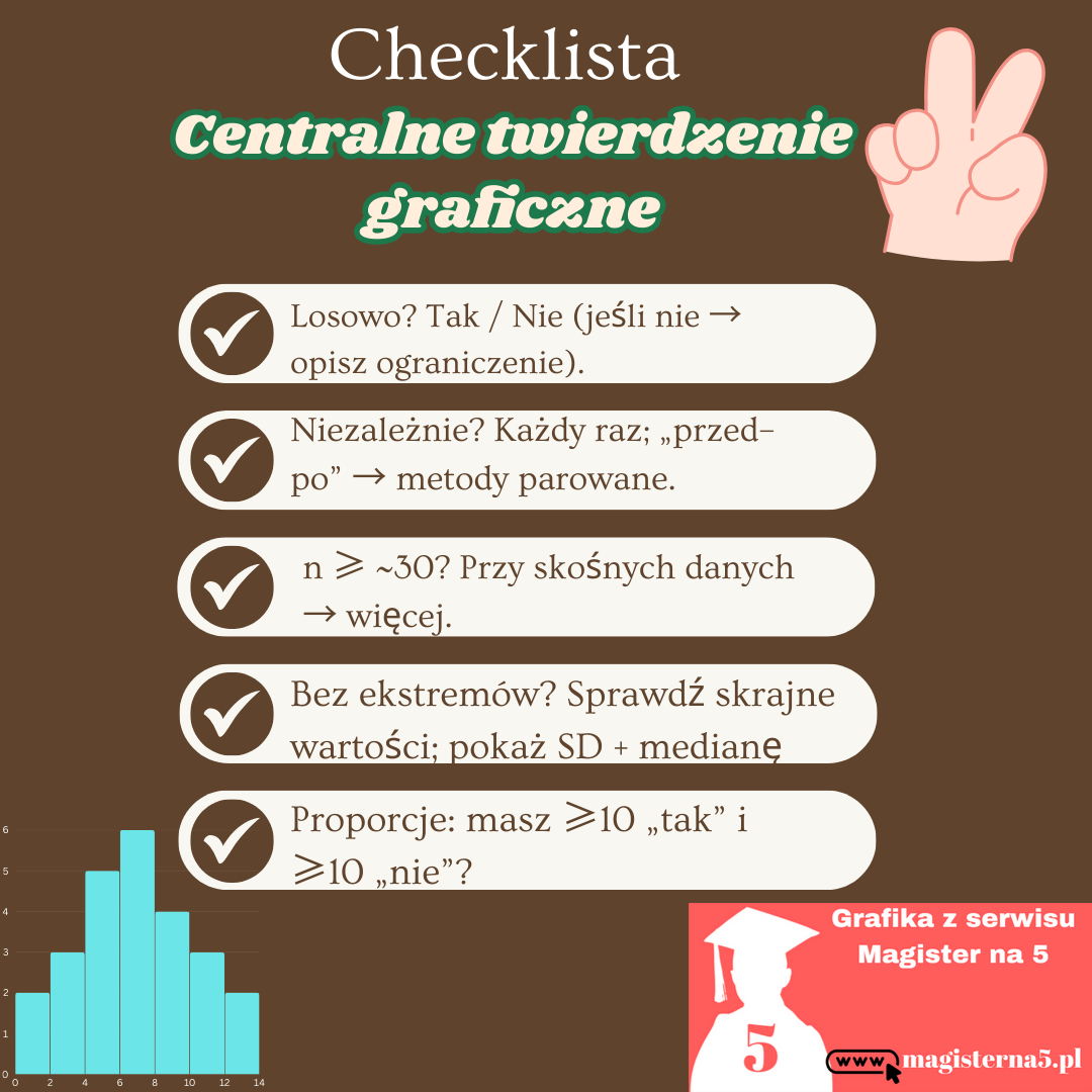 Gotowe. Jeśli to odhaczysz, możesz śmiało korzystać z wnioskowania na średnich (te „około …, ± …”), czyli dokładnie tego, czego potrzebujesz do rozdziału „Wyniki”.
