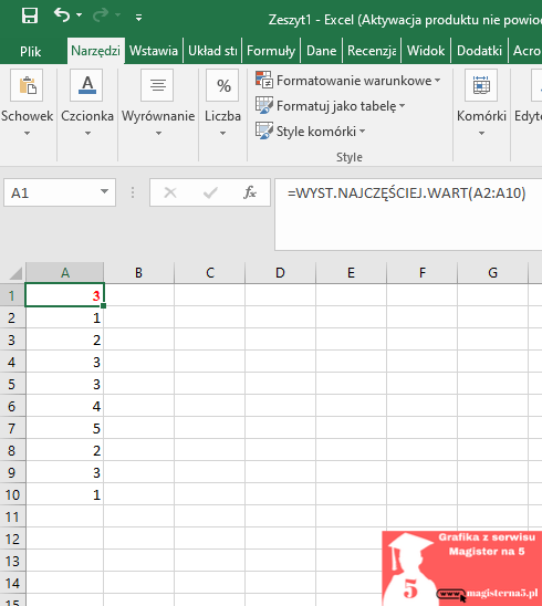 - = WYST.NAJCZĘŚCIEJ.WART(A2:A10)