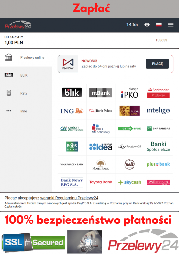 - Przelewy 24. Nasze płatności obsługuje firma Przelewy 24, polski lider płatności online. Jesteśmy przez nich cyklicznie weryfikowani i sprawdzani. Oni po prostu nie pozwoliliby nam na żadne nieprawidłowości.