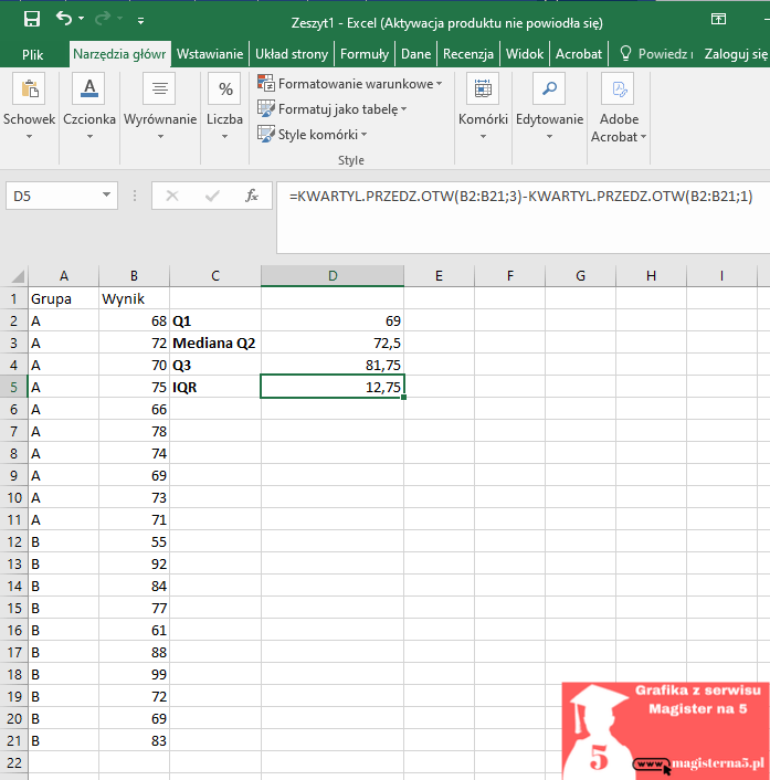 ❌ Błąd: podanie suchych liczb – „Q1 = 69, IQR = 12,75” – bez wyjaśnienia.