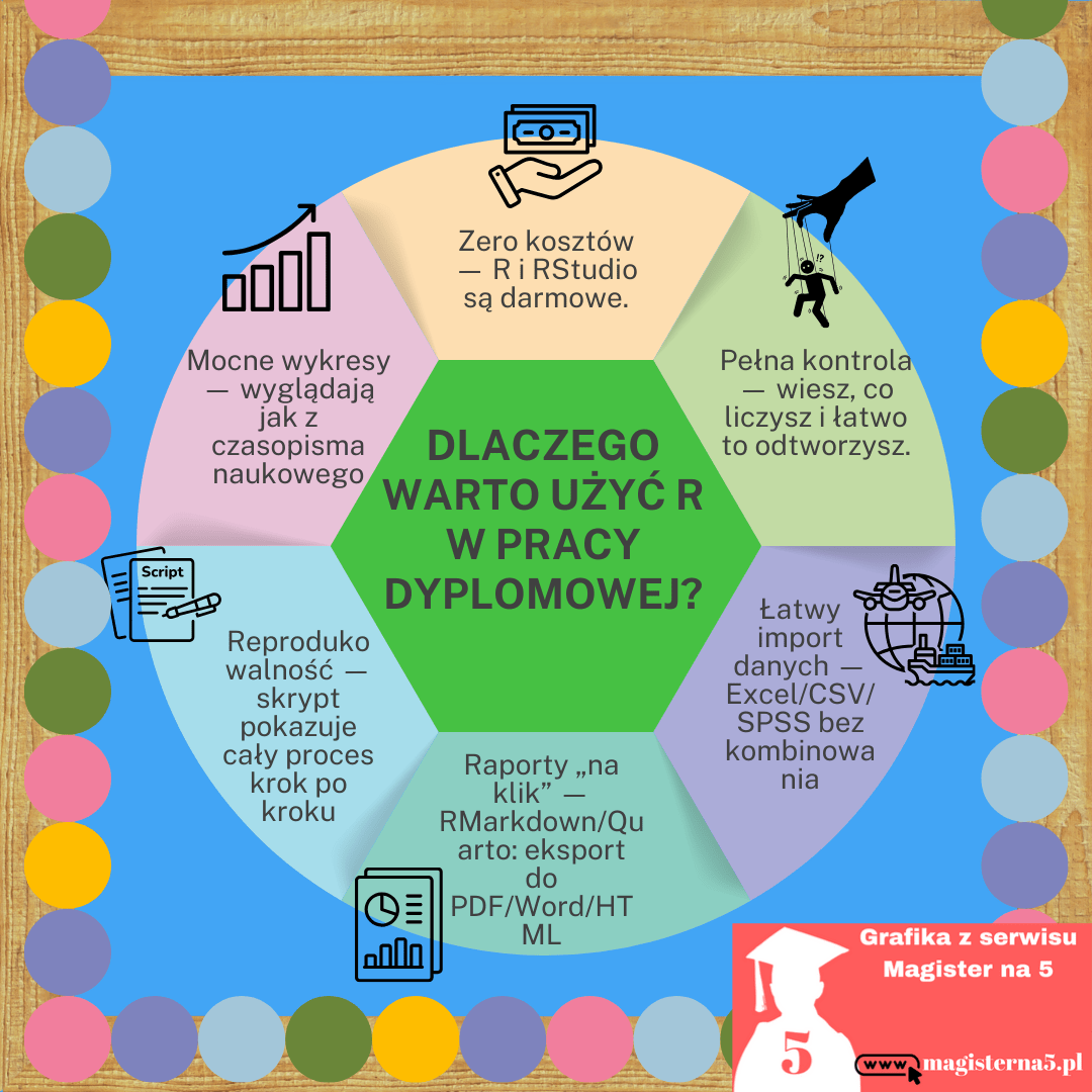 Najlepsze? To, czego nauczysz się przy dyplomie, zostaje z Tobą na później: w pracy, na studiach podyplomowych, w kolejnych projektach. Zacznij od małych rzeczy — wczytaj dane, policz opisówki, zrób jeden wykres — i stopniowo dokładaj kolejne cegiełki. R naprawdę nie gryzie. A gdy złapiesz rytm, zostaje najprzyjemniejsze: dobra kawa, czysty skrypt i poczucie, że masz pełną kontrolę nad swoimi wynikami. ☕📊
