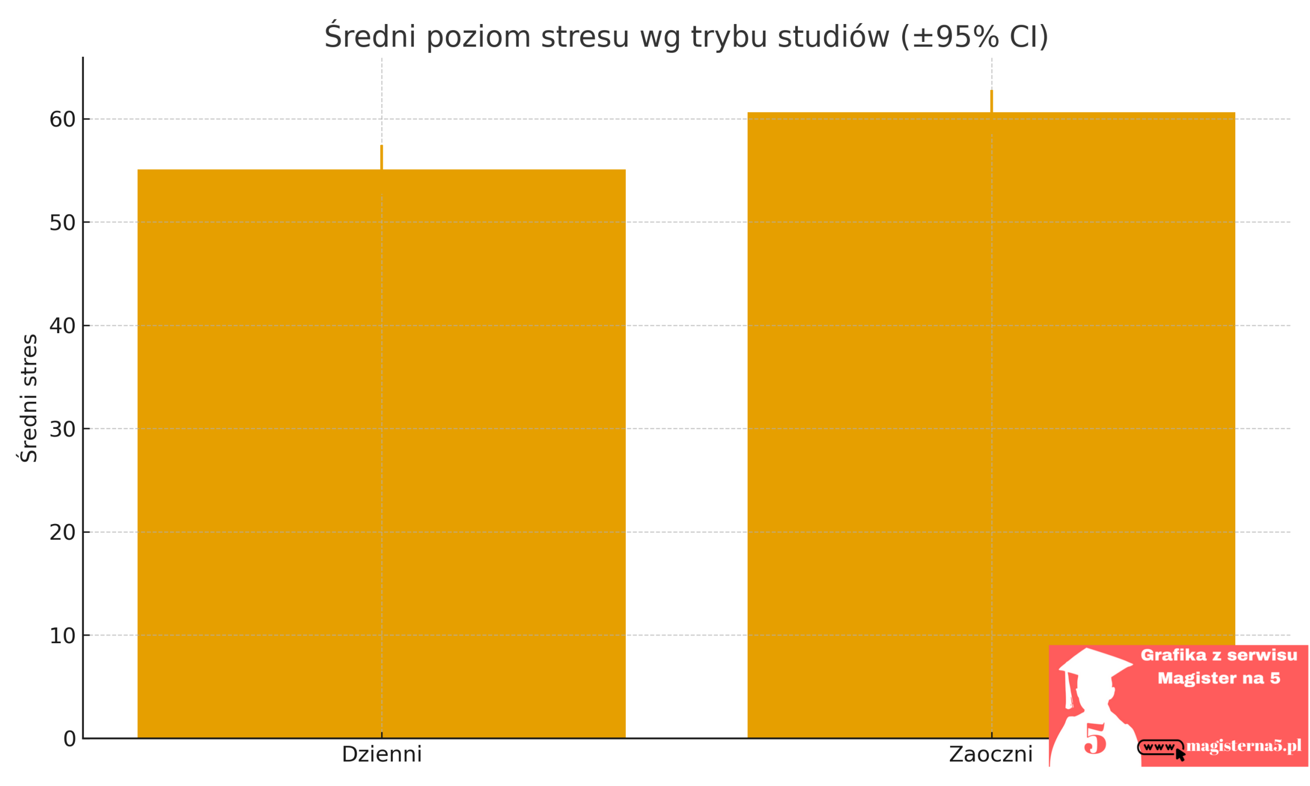 Pokazuje średni poziom stresu u studentów dziennych i zaocznych wraz z przedziałami ufności. W przykładzie słupek „zaocznych” jest wyższy — sugeruje wyższy średni stres w tej grupie.
