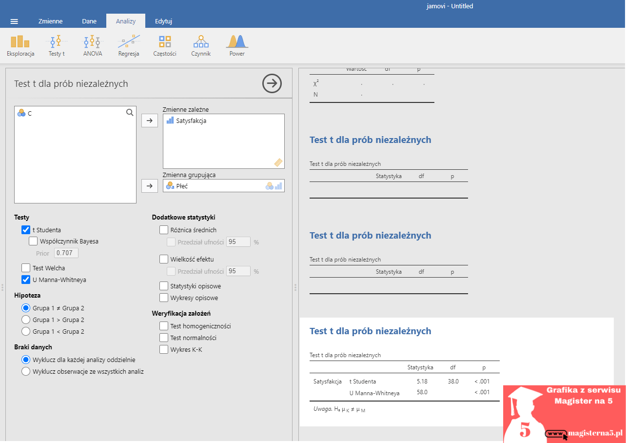 Naprawa (jamovi): Analizy → T-tests (próby niezależne) → odznacz t/Welcha, zaznacz „Mann–Whitney U”; w nowszych wersjach: Analizy → Nieparametryczne → Dwie niezależne.